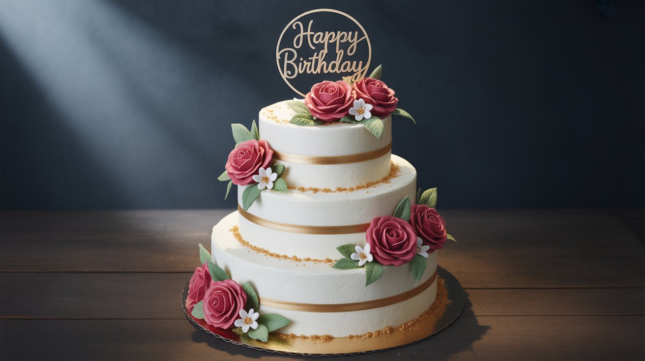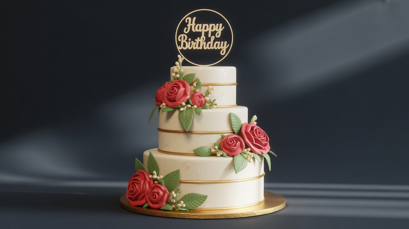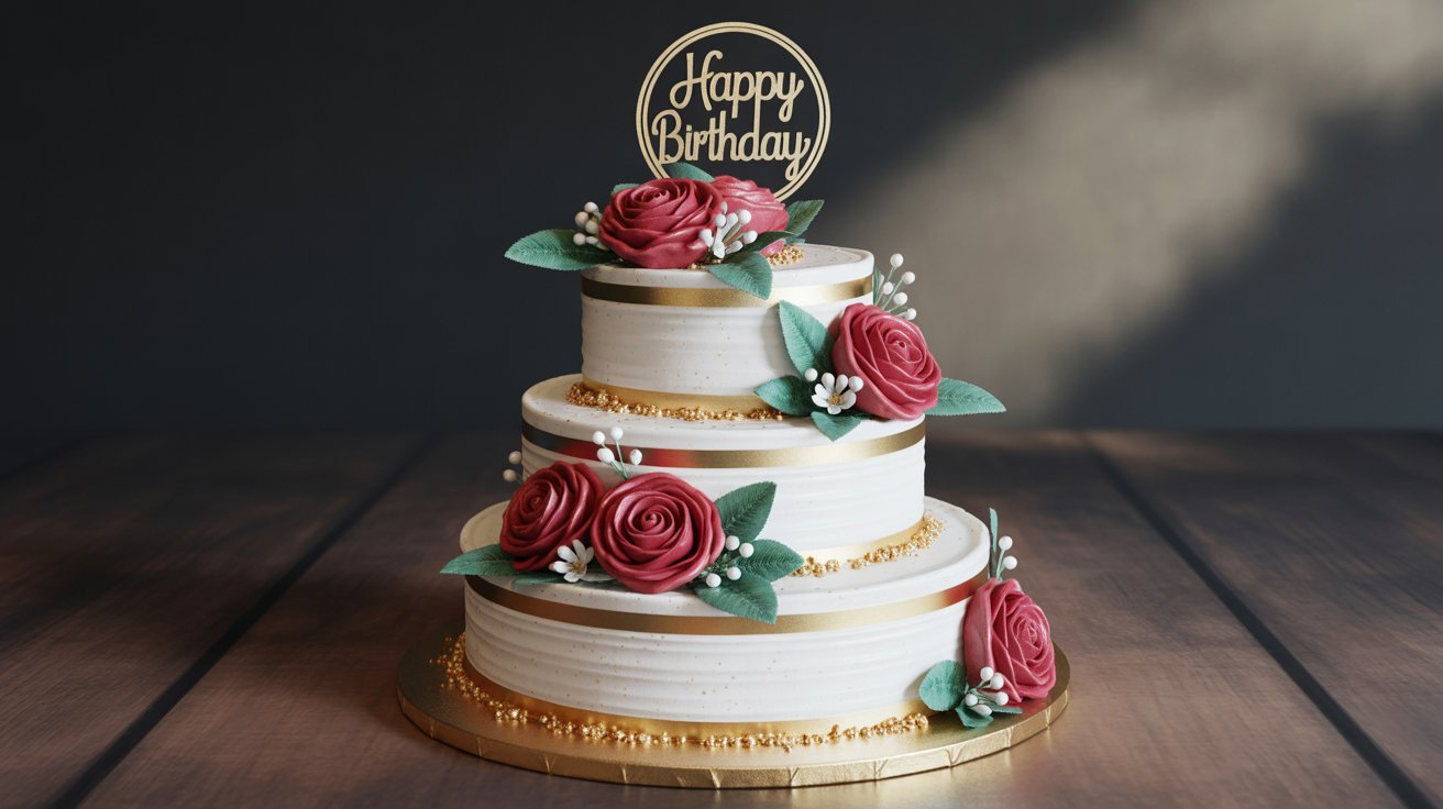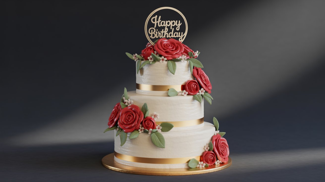 Celebrate big with our 3-Tier Red Rose Birthday Cake β€” classic white tiers, bold red roses & gold ribbons. Perfect for milestones & grand celebrations. Order online now!