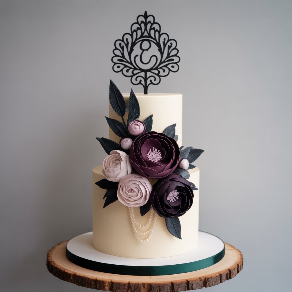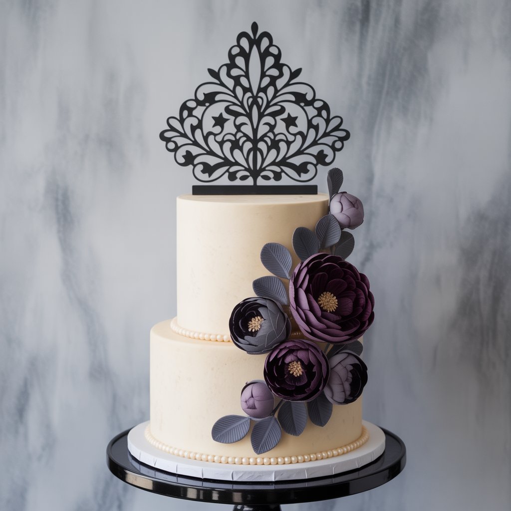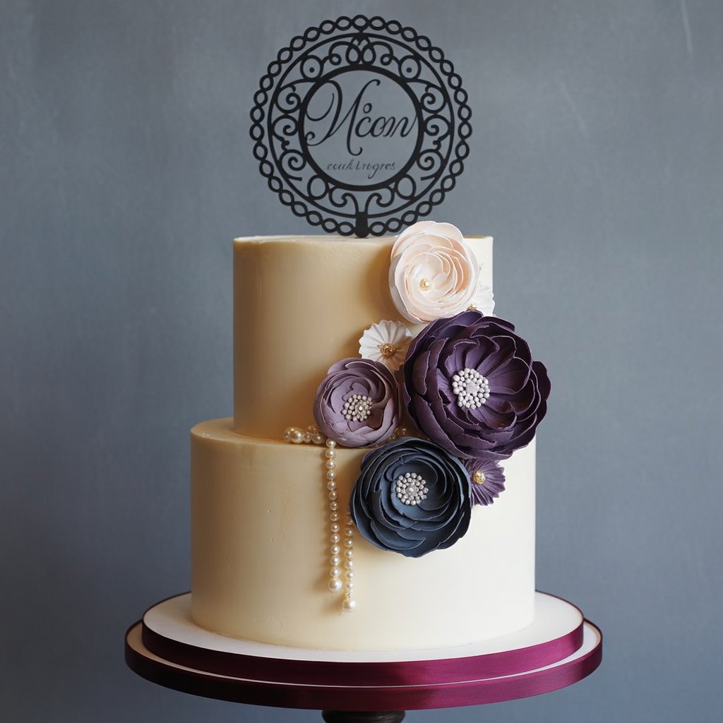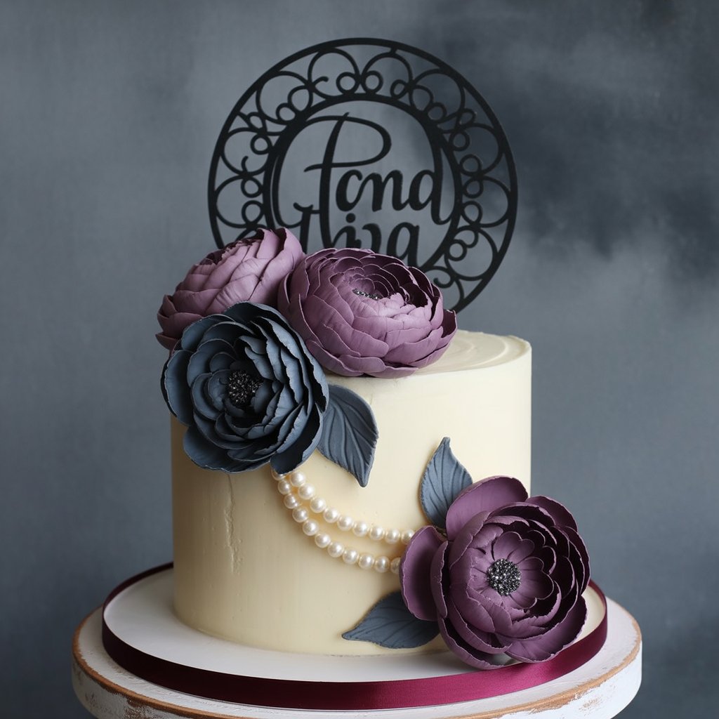 A premium two-tier ivory cake adorned with handcrafted sugar flowers in deep purple, dusty rose, and charcoal, accented with edible pearls and a custom black lace topper (e.g., name or monogram). Perfect for weddings, anniversaries, or elegant celebrations. Serves 10–12. Eggless option available. Gift-ready presentation.