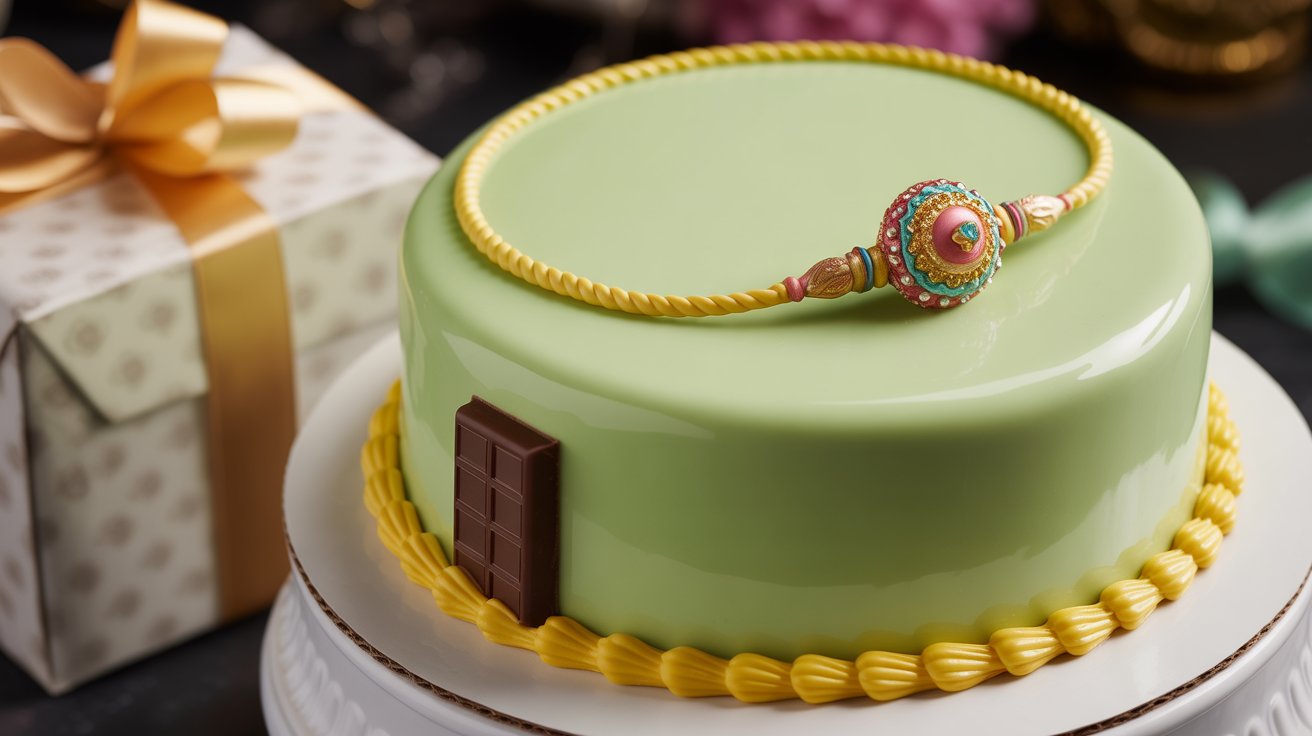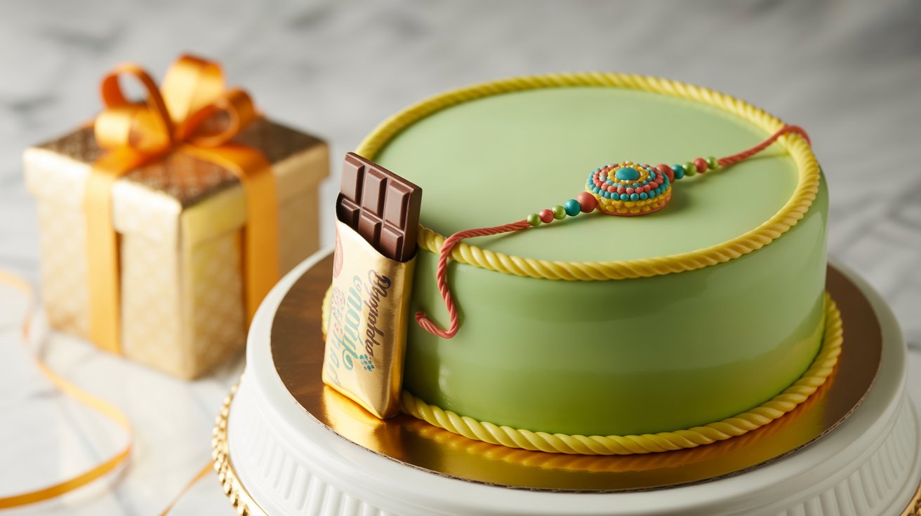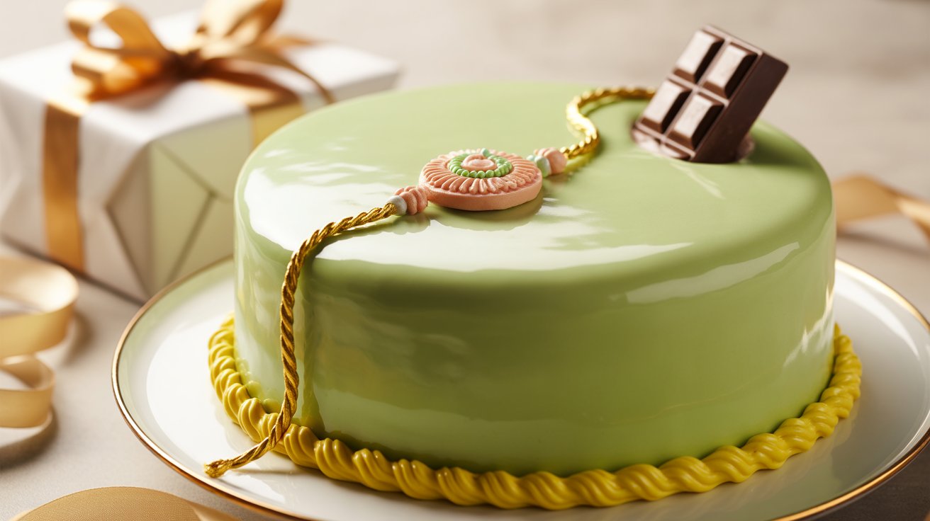 A stunning Rakhi-themed cake with smooth pistachio-green mirror glaze, golden rope border, and an edible rakhi topper with intricate beadwork. Features a realistic chocolate bar side accent. Perfect for Raksha Bandhan gifting — elegant, delicious, and culturally meaningful. Serves 8–10. Comes gift-boxed with ribbon (as shown). Custom names or colors available.